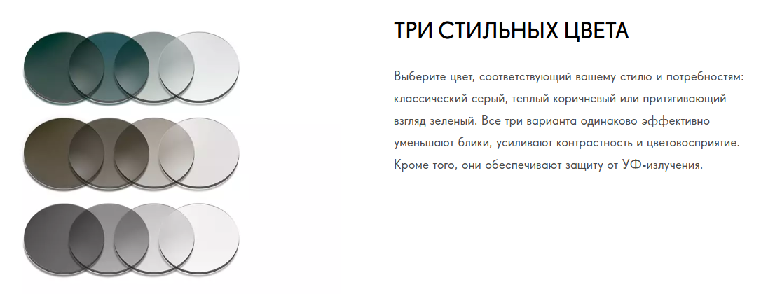 | Свойства | Фотохромные (Sensity 2), быстрое затемнение и осветление, 100% защита от УФ, естественная цветопередача |